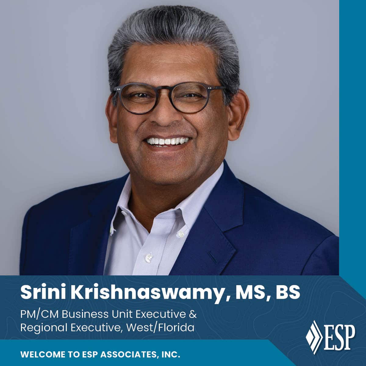 ESP is proud to welcome Srini Krishnaswamy, Program Management / Construction Management (PM/CM) Business Unit Executive, to our enterprise of companies. Srini is based in Tampa, Florida, and will oversee the growth and operations of our PM/CM business unit as we continue our expansion.